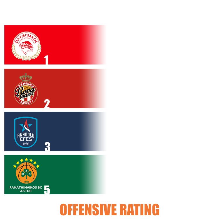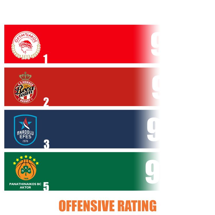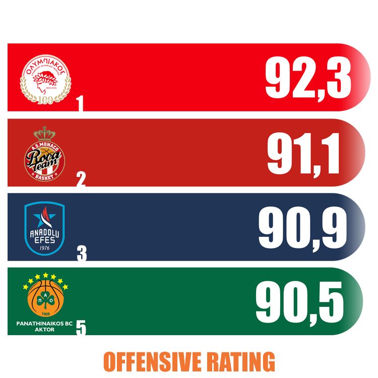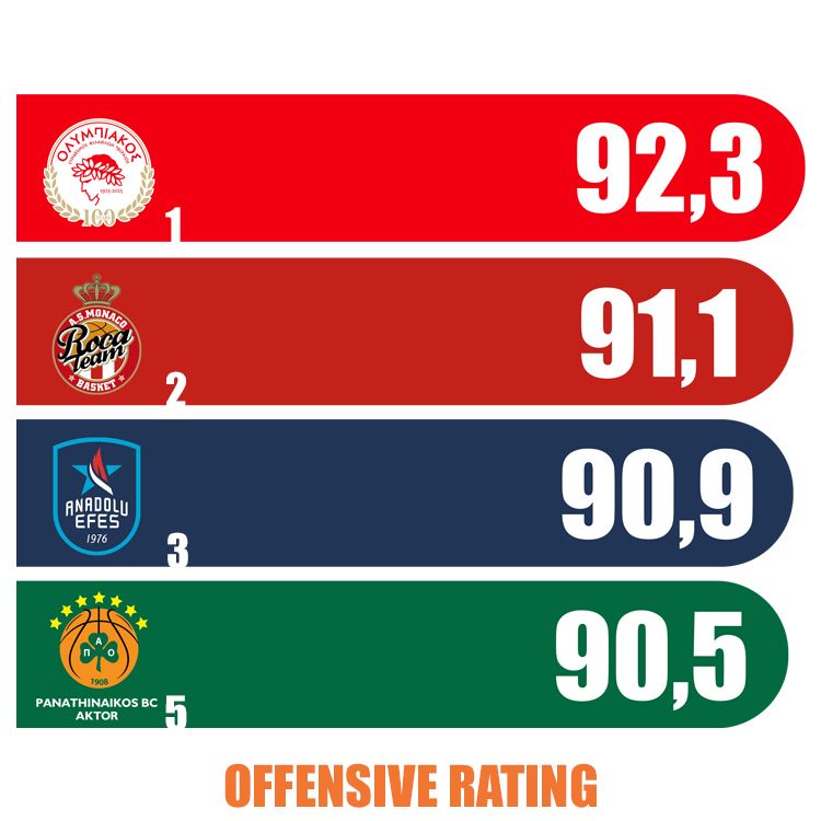 Δεύτερη ακολουθεί η Μονακό με 91.1, έχοντας προσεγγίσει όσο περισσότερο γίνεται τα νούμερα του Ολυμπιακού. Και από εκεί και πέρα μπορούμε να σημειώσουμε πως υπάρχει αρκετό ταλέντο και ομάδες που λειτουργούν εξαιρετικά στην επίθεση. Χαρακτηριστικό πως έξι ομάδες έχουν 90+ στο ORTG. Στην τρίτη θέση συναντάμε την Εφές με 90.9, οριακά πάνω από την Μπάγερν.