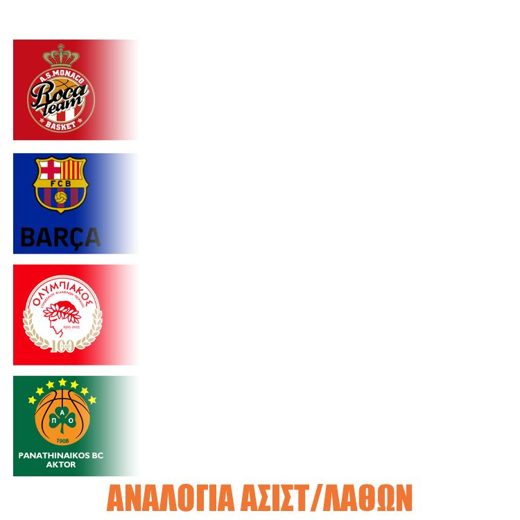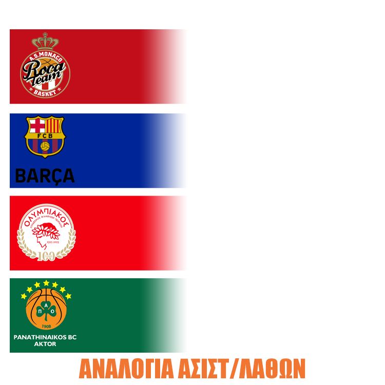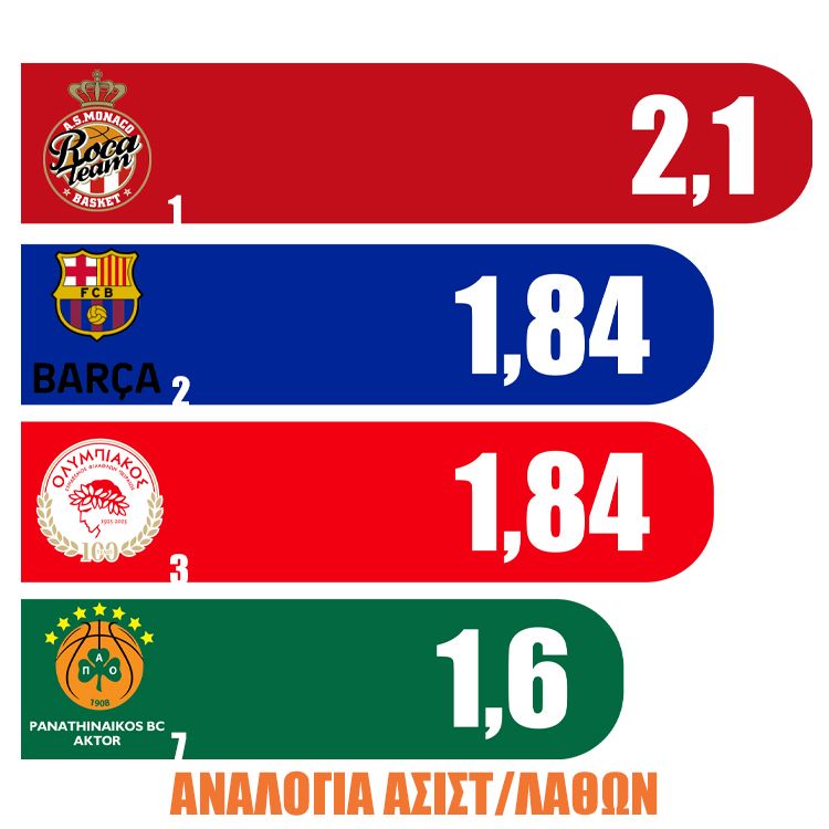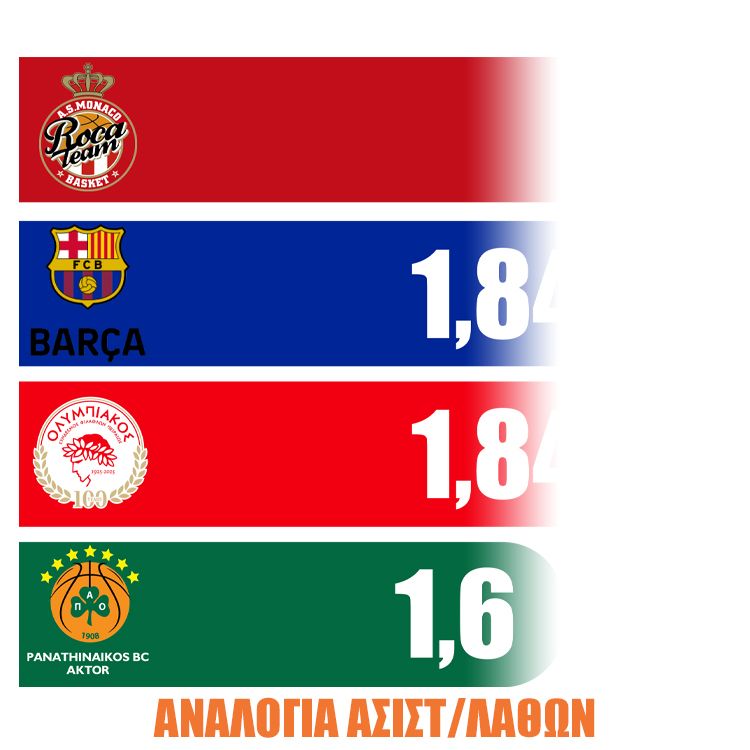 Ο Ολυμπιακός του Γιώργου Μπαρτζώκα δε θα μπορούσε να λείπει από αυτήν την κατηγορία. Με 1.84 ασίστ ανά λάθος είναι στη δεύτερη θέση της σχετικής λίστας, μαζί με την Μπαρτσελόνα. Εδώ και οι δύο Σέρβοι, αφού ο Ερυθρός Αστέρας ακολουθεί με 1.75 και ο η Παρτίζαν με 1.67.