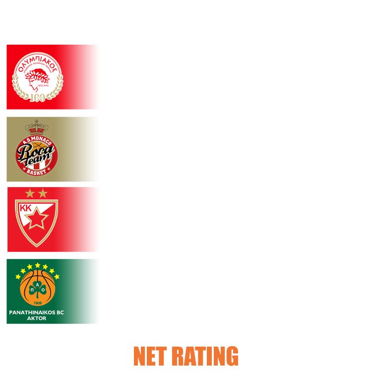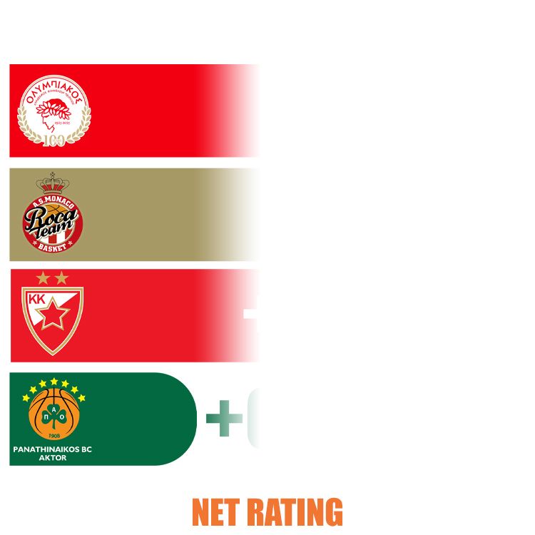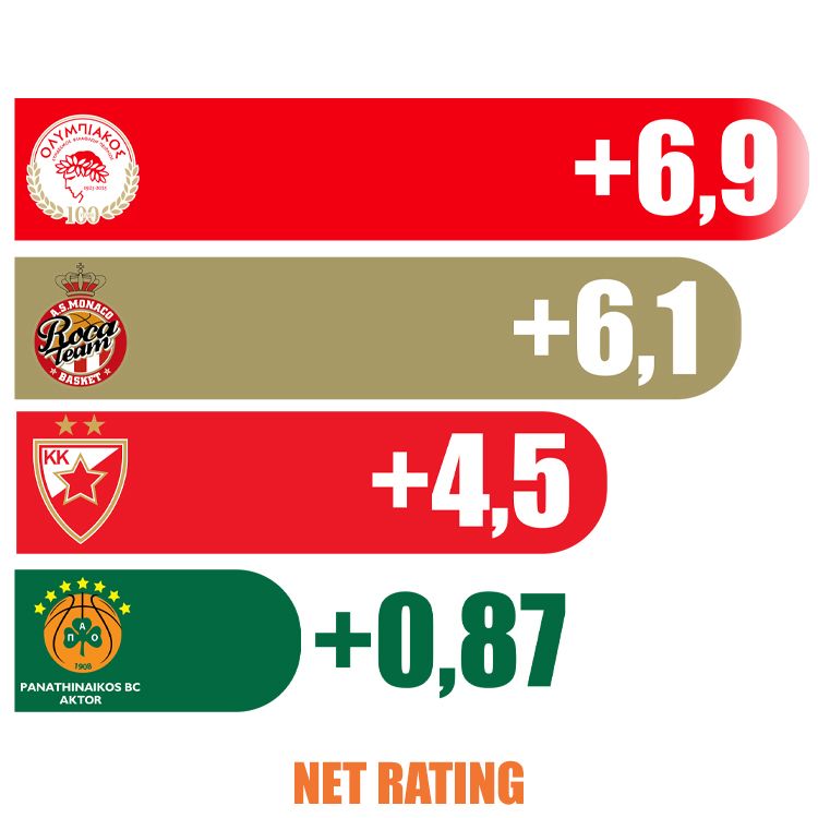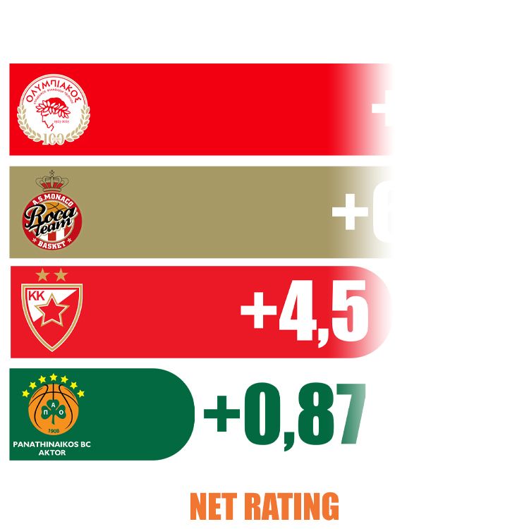 Ο Ολυμπιακός βρίσκεται στην κορυφή. Πρώτη επίθεση, τέταρτη καλύτερη άμυνα. Η αφαίρεση θα τον έβγαζε ψηλά και το +6.9 τον φέρνει πρώτο. Πίσω του η εκπληκτική Μονακό, που συνεχίζει με τον Βασίλη Σπανούλη στον πάγκο να προχωρά ακάθεκτη και έχει το πολύ καλό +6.1. Εδώ ήρθε η ώρα να βγάλουμε το καπέλο στον Γιάννη Σφαιρόπουλο. Ο Ερυθρός Αστέρας έχασε έναν πολύ επιδραστικό ψηλό για μεγάλο διάστημα, τον Τζοέλ Μπολομπόι αλλά κρατά ψηλά, κυρίως λόγω άμυνας, τους δείκτες του. Οι Σέρβοι βρίσκονται στην τρίτη θέση του NTRG με +4.5.