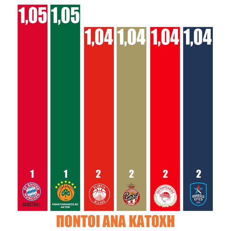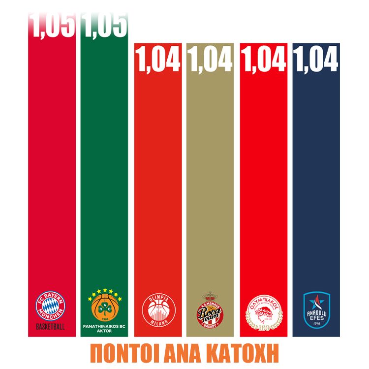 Από εκεί και πέρα όμως, Μπάγερν και Παναθηναϊκός με 1.05 πόντους ανά κατοχή είναι οι πιο αποδοτικές ομάδες της EuroLeague. Βλέπουμε όμως ξανά ότι έχουμε πολύ καλές ομάδες όσον αφορά την επίθεση, αφού με 1.04 πόντους ανά κατοχή ακολουθούν η Αρμάνι, η Μονακό, ο Ολυμπιακός και η Εφές.