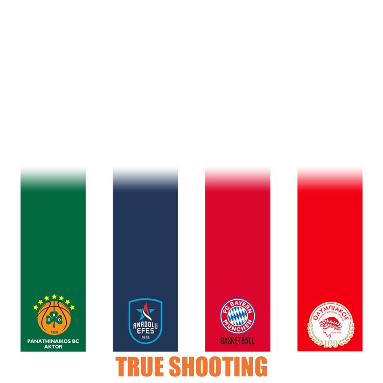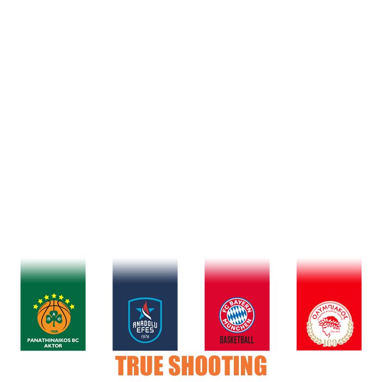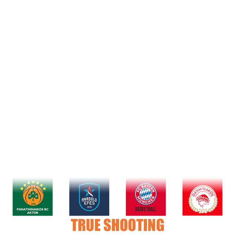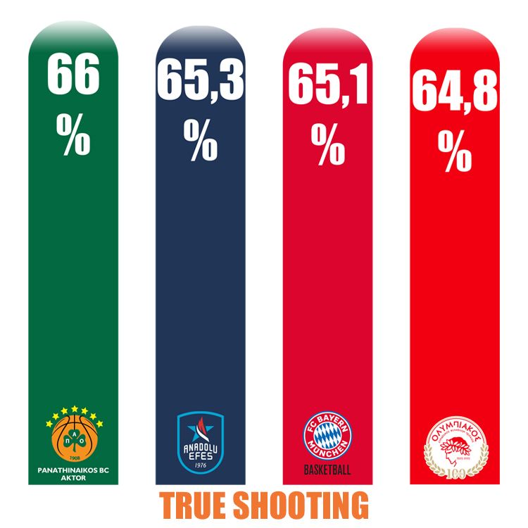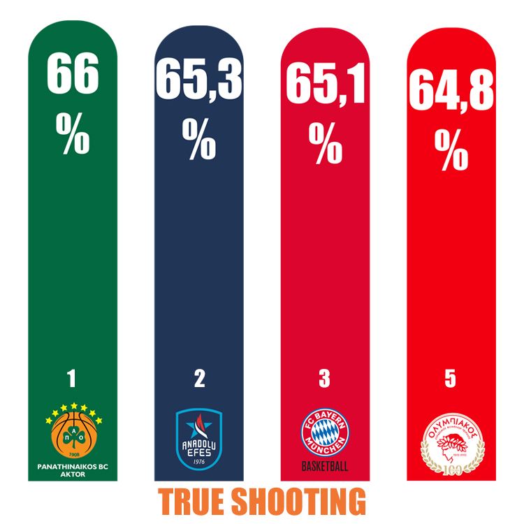 Ο Ολυμπιακός δε θα μπορούσε να είναι μακριά από τις πρώτες θέσεις εδώ. Η ομάδα του Σάσα Βεζένκοβ άλλωστε, με τον Βούλγαρο φόργουορντ να εκτελεί με τέτοια συχνότητα και ευστοχία γύρω από το καλάθι, δε γίνεται να μην πλησιάζει υψηλά ποσοστά. Ο Ολυμπιακός με 64.8% στο True Shooting % τοποθετείται στην πέμπτη θέση. Δεύτερη είναι η Εφές με 65.3%, ενώ ακολουθεί η Μπάγερν με 65.1% και η Αρμάνι Μιλάνο με 65%.