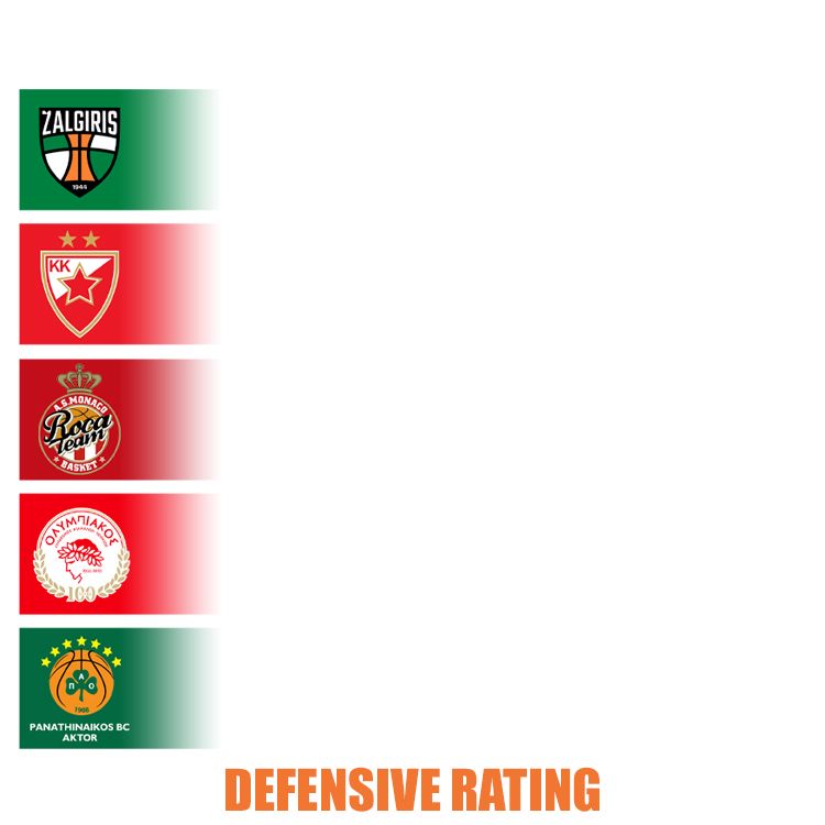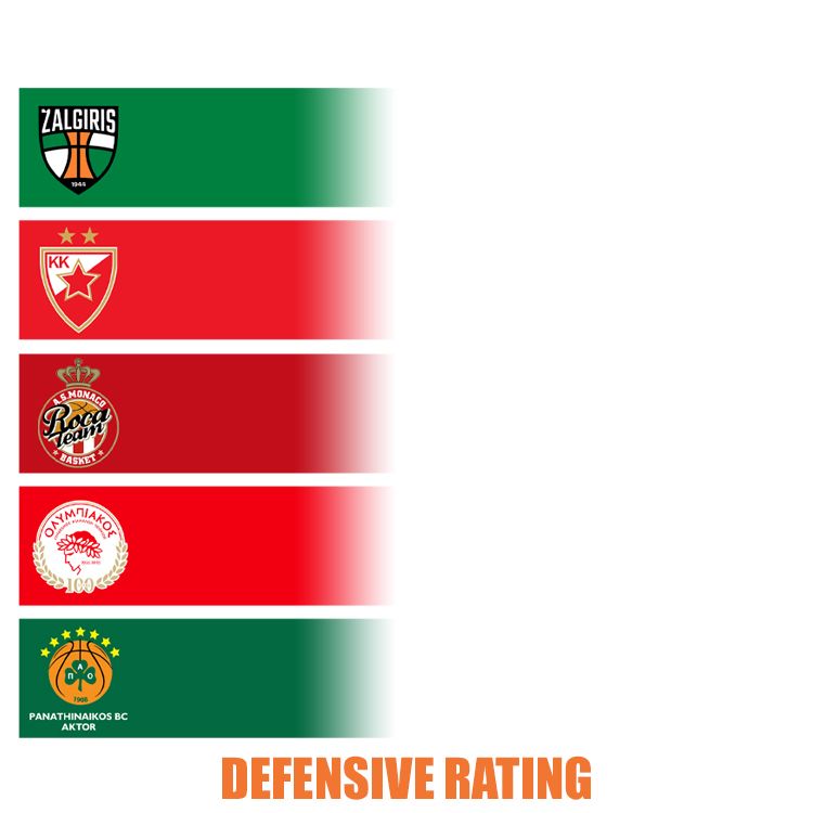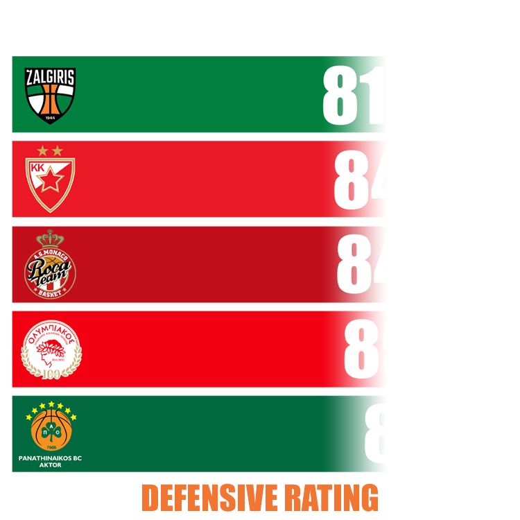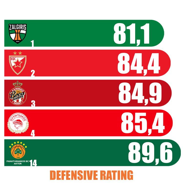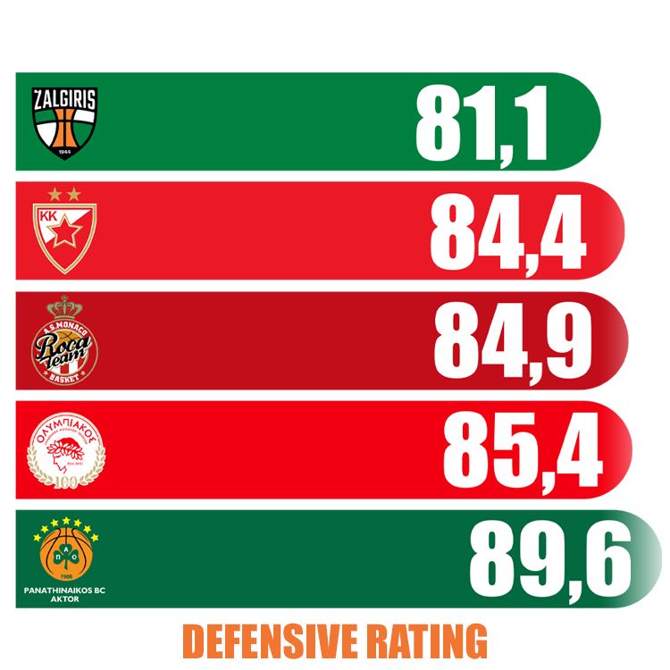 Και αφού τα σημειώσαμε αυτά για τους «πράσινους», ποια είναι τελικά η καλύτερη άμυνα; Ο κύριος Αντρέα Τρινκιέρι μας λέει μπουόνα σέρα από το Κάουνας, έχοντας τη Ζάλγκιρις με την καλύτερη αμυντική επίδοση στο 81.1 που μετράει για το Defensive Rating. Ακολουθεί ο Ερυθρός Αστέρας και η Μονακό, που τη βλέπουμε και εδώ σε πολύ καλή θέση.